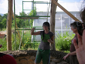 Student building a cob structure for compost storage.